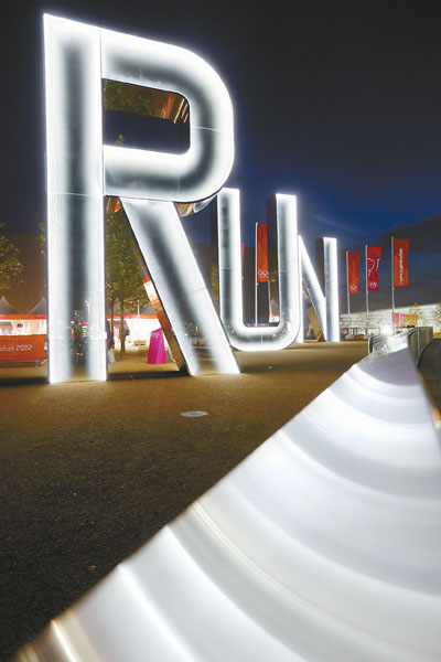 近日,在英国伦敦,人们从“铜盒”手球馆附近点亮的雕塑旁经过。