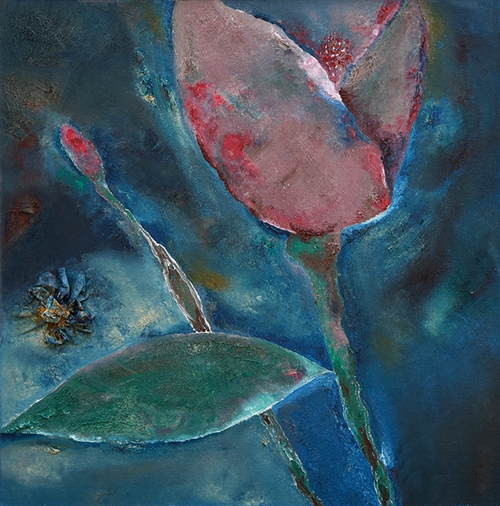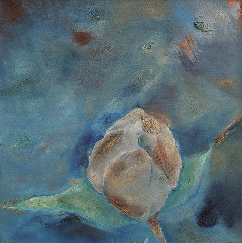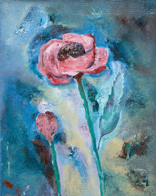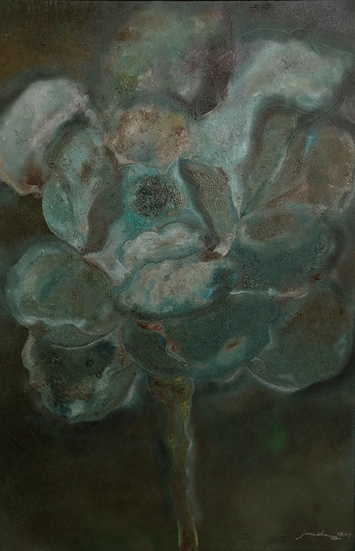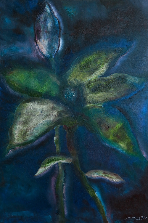 艺术品的观感上,第一眼的直觉很重要,《蓝色植物》就是这样以弱取胜,光线和色泽均处于弱势的光谱,不起眼和混沌成了扑面而来的基调。几片非绿非蓝的叶瓣,有的还被一大块苍白侵蚀,它们都被难以言说的痛苦压抑地不成形,甚至那种无法忍受的境遇,感觉是穿破了植物的衣裳才终究得以释放。