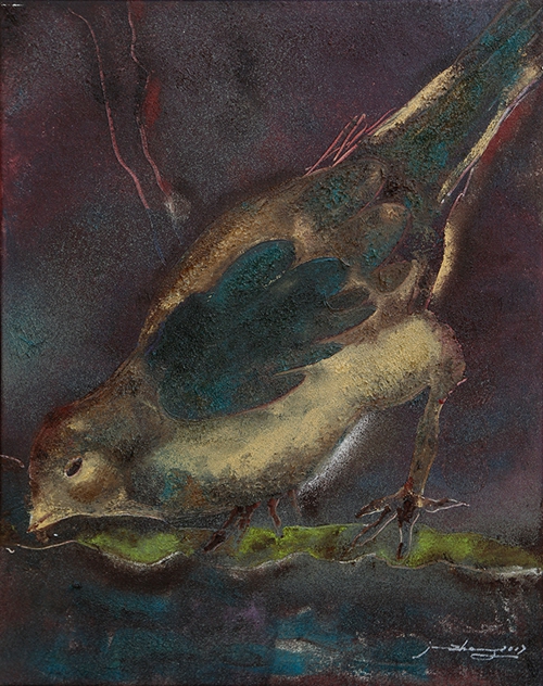 初看之下,像一只写实的小鸟,细小的眼睛想要眯起来,大概看到下方有一处躲避喧嚣的乐园。可同时,欲想轻轻一跃的姿态,被时间和命运那无形的绳索捆住,或许这就是它保持“沉默”的缘由。