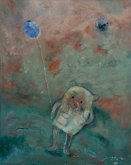 《小熊娃娃》让人深思的地方还在于,我们被流动的色彩像气球提升上去,再回望手系气球的小熊神态,你又会变得无从捉摸,气球的一收一放,你的思维和感受也同时变得迥异有别,因为小熊那莫测的表情里隐藏一丝不易觉察的故作惊讶,它瞬间颠覆了你刚才还深信不疑的信仰。如果再进一步仔细地揣摩,它会使得我们顿时陷入存在的怪圈,然而,表面上,我们会心甘情愿带着希望的气球远走高飞,这就是作品多层次的美学感染力所致。