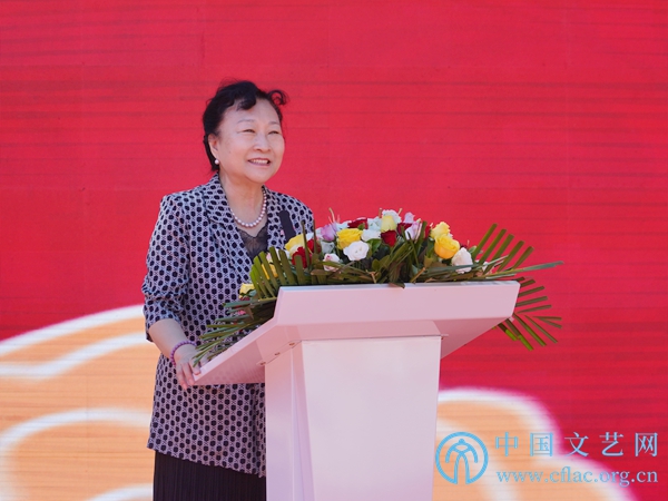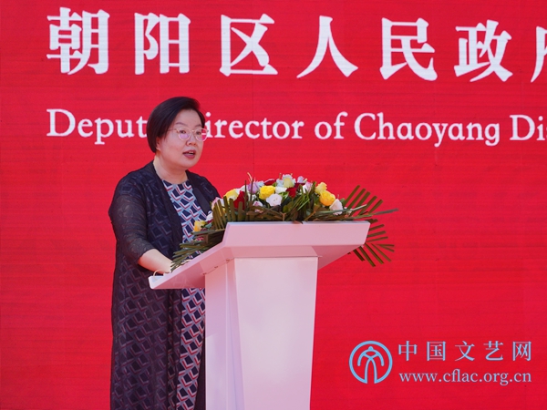 图为朝阳区副区长杨蓓蓓致辞,表示北京金漆镶嵌艺术博物馆的建立是积极助推北京博物馆之城打造的生动实践。