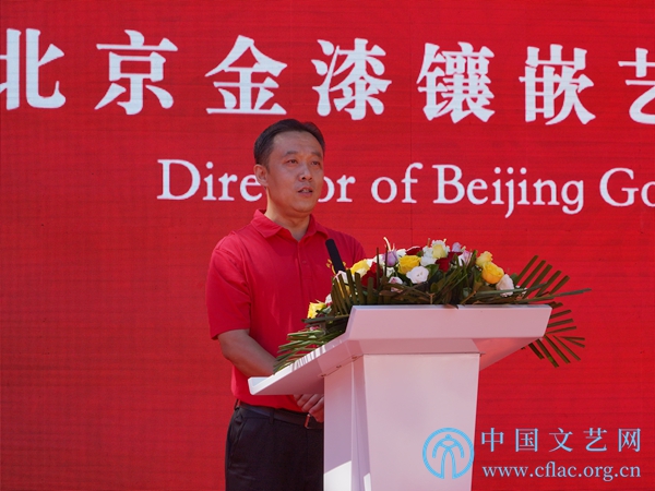 图为国家级非物质文化遗产项目“金漆镶嵌髹饰技艺”代表性传承人柏群致辞,希望青年传承人以前辈为榜样,推动以金漆镶嵌和燕京八绝为代表的中华优秀传统文化立足北京、面向全国、走向世界。