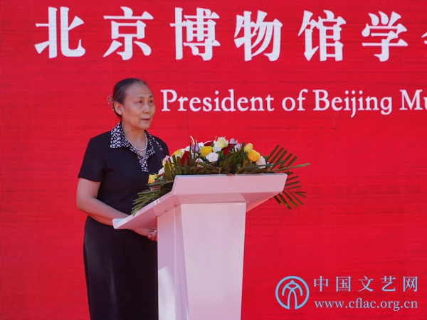图为北京博物馆学会理事长刘超英致辞,希望博物馆未来以丰富的藏品资源为基础,充分发挥工美大师、青年传承人与设计师资源优势,对博物馆藏品进行深入研究和开发。