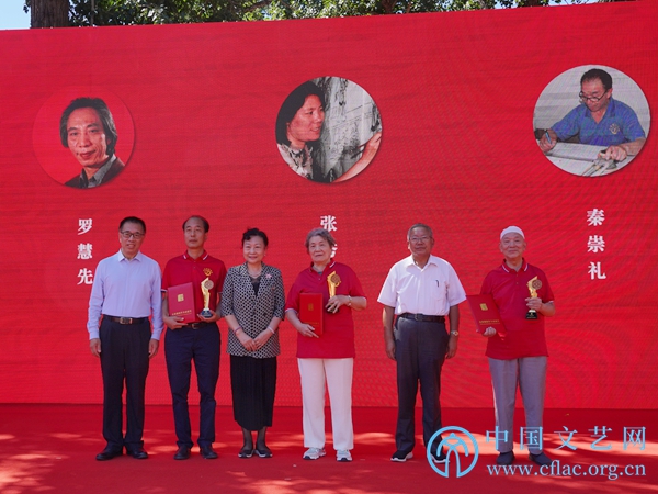 图为北京金漆镶嵌博物馆授予北京市工艺美术大师张秀珍、罗慧先、秦崇礼“金漆镶嵌终身成就奖”。