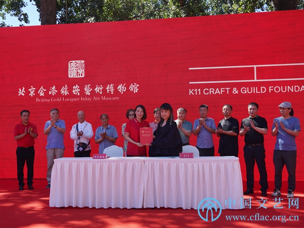 图为开馆仪式上,北京金漆镶嵌艺术博物馆与K11 Craft & Guild Foundation Limited签署战略合作协议,在文创作品的创意研发上加强沟通与合作,探寻博物馆营销与市场创新的发展途径。