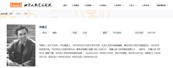 北京人艺官网资料显示,刘锦云生于1938年,河北雄县人。1963年毕业于北京大学中文系。1963年开始发表作品。1983年加入中国作家协会。
