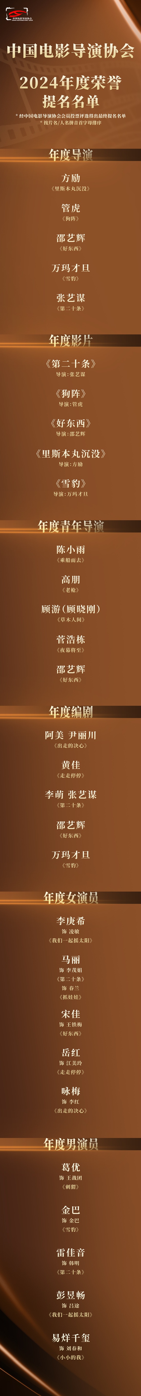 6月30日,中国电影导演协会“2024年度荣誉”提名名单揭晓,方励(《里斯本丸沉没》)、管虎(《狗阵》)、邵艺辉(《好东西》)、万玛才旦(《雪豹》)和张艺谋(《第二十条》)获得“年度导演”提名;《第二十条》《狗阵》《好东西》《里斯本丸沉没》和《雪豹》五部影片获得“年度影片”提名。