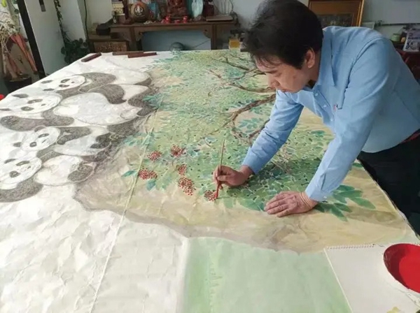 画家刘中正在创作盛世双宝图
