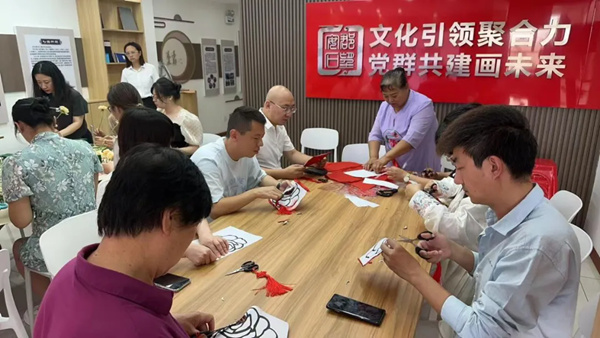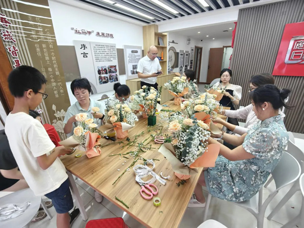 走进乐丰明德非遗体验基地,七夕礼俗宣讲、笔圣结缘、浪漫插花、编同心扣等社区民俗活动吸引辖区群众参与。熏样剪纸传承人孙立荣老师、葫芦烙画雕刻技艺邱景鹏老师、吉林省级非遗传承人贾氏钩编贾春红老师向大家介绍非遗项目作品,宽城区书协副秘书长朱晓凤、办公室主任张维洋、会员朱艺静现场挥毫泼墨,为辖区群众带来别样的节日文化体验。随后,大家用新鲜花束、枝蔓制作捧花,表达了对传统文化节日的喜爱和对美好生活的向往。
