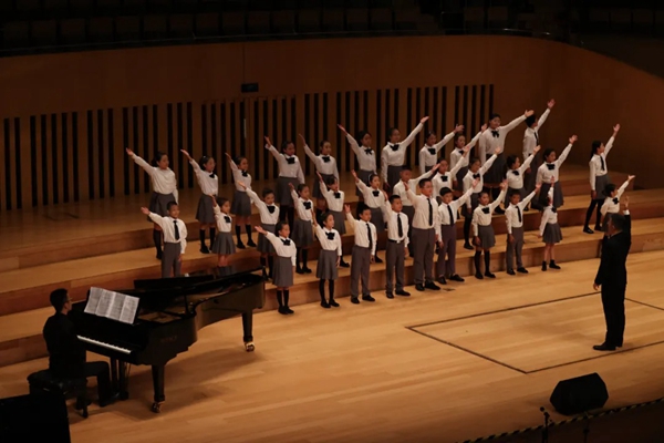 随后登场的泰山大剧院童声合唱团现场演绎了《花蛤蟆》《四季泰山》两首作品,他们以天籁般的嗓音、娴熟的技巧和甜美的笑容赢得了现场观众的掌声和赞美。《花蛤蟆》是一首富有浓郁地方风格与儿童情趣的山东儿歌,采用了模仿、描绘与夸张的手法,表现农村儿童在认识蛤蟆的过程中感到好奇、新异、喜悦的心理活动的儿歌,语调表现十分生动。《四季泰山》则是合唱团青年指挥黄鸽的原创合唱作品,展现出“五岳之首”泰山的四季变换,用童声传递出对家乡的热爱。
