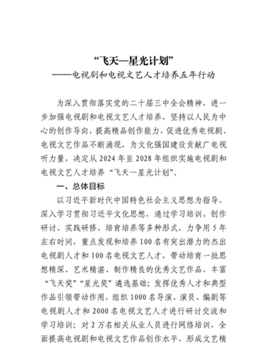 为深入贯彻落实党的二十届三中全会精神,进一步加强电视剧和电视文艺人才培养,提高精品创作能力,促进优秀电视剧、电视文艺作品不断涌现,国家广播电视总局启动实施《“飞天—星光计划”——电视剧和电视文艺人才培养五年行动》。以下为全文↓↓↓