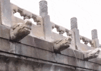 故宫“千龙出水”与南京明城墙“龙吐水”不同的是,排水口处多了龙头作为装饰。“千龙出水”位于太和殿广场。太和殿、中和殿、保和殿前后排列,坐落在8米多高的工字型三层台基上。在台基四周栏杆底部,有排水孔洞,每根望柱下还有一个雕琢精美的石龙头,也是主要排水口,三层共有龙头1142个。这些龙头也称螭首或角兽,是用于须弥座转角处和望柱外缘之下的排水构建,多镌刻成龙首形,既能排水,又具有很好的装饰作用。每逢下雨,雨水逐层下落,使台面无积水,雨水从螭首龙头孔中流出,在大雨时如白练,小雨时如冰柱,而暴雨时,则会呈现“千龙出水”景象,蔚为壮观。