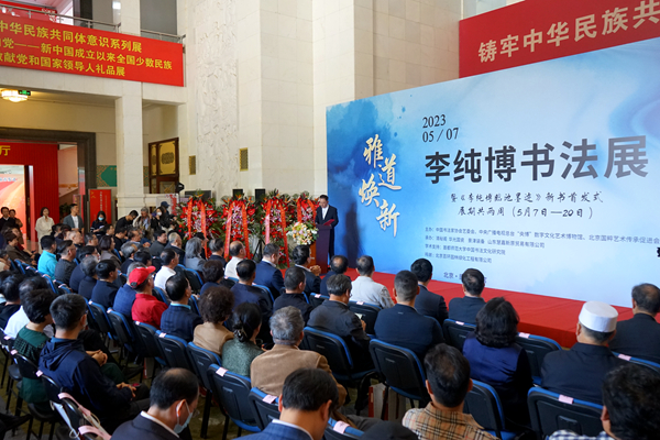 5月7日,由中国书法家协会艺术委员会、中央广播电视总台“央博”数字文化艺术博物馆、北京国粹传承艺术促进会共同主办的“雅道焕新——李纯博书法展”暨《李纯博临池墨迹》新书首发式在北京民族文化宫开幕。此次展览集中展示了中国书法家协会第五、六、七届理事,中央电视台戏曲和音乐频道副总监李纯博临写的《神策军碑》《明成化碑》《倪宽赞》《石鼓文》四种经典正书作品及篆刻、绘画作品、书名题写等。
