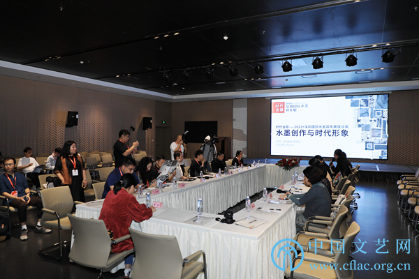 开幕式后,还举行了“水墨创作与时代形象”专题座谈会。深圳画院策展人郭延容主持座谈会,邱敏、王子蚺、游江、李原原、彭宝玉、房桦、肖更浩、卢杨丽、黄丽平、邱武霞、吴蔚、李琼波、韩晶、古秀玲等14位学者就“深圳国际水墨双年展”作品中,表现出的时代语言和时代形象展开探讨,并对水墨这种艺术媒介的在新时代的拓展,作出展望和探索。