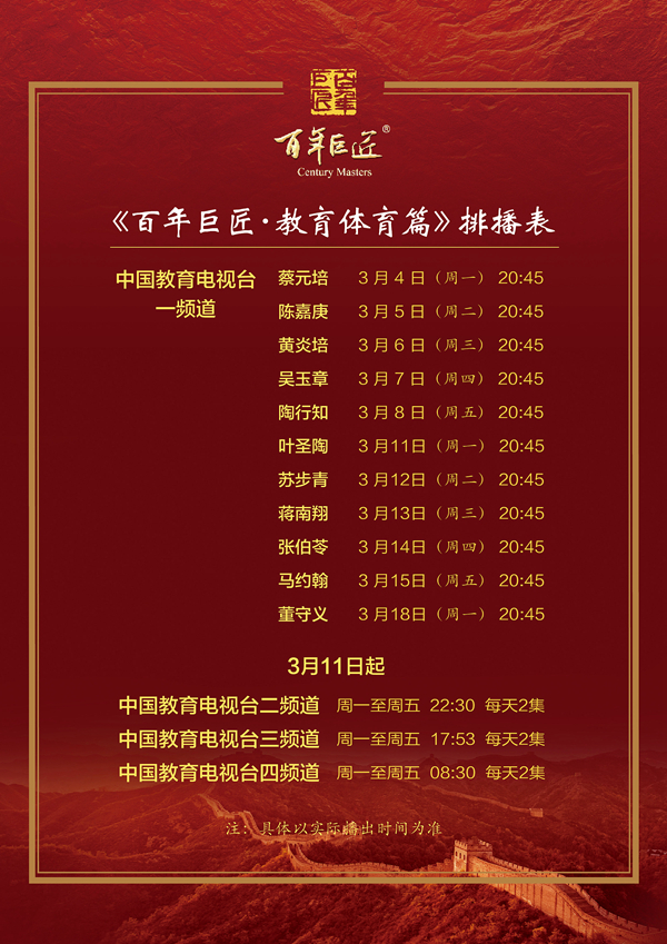 由中国文学艺术界联合会、中国文学艺术基金会、中国艺术研究院、中国教育电视台、百年巨匠(北京)文化传播有限公司等单位联合策划制作的大型人物传记纪录片《百年巨匠·教育体育篇》,将于3月4日至18日在中国教育电视台播出。