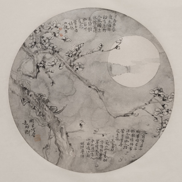 丘挺的《明月何曾是两乡》和《暗香》两幅参展作品在视觉表现上采用了传统水墨画技巧,以梅花和月亮为载体,探讨了东方文化中的静寂美学。作品通过梅花与月光的互动,映射着梅花的孤高与坚韧;利用水墨的渲染与留白技法,传递着超越物质世界的宁静与深邃,体现了艺术家对自然与人文的双重解读。