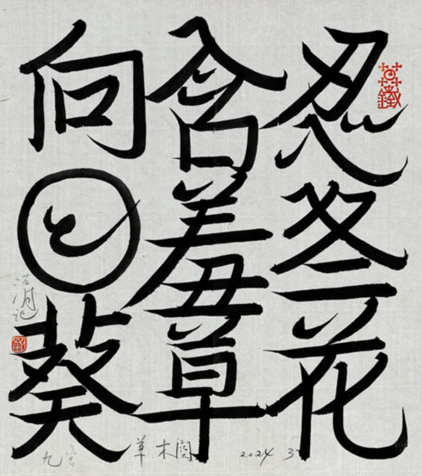 刘彦湖的两幅参展作品《九宫·草木阕》《九宫·桃花春水》系应邀为本次展览专门创作,延续了他大九宫系列的作品风格,是三言集联的铺衍、独特的书法文本写作,让词语按自身的逻辑和意韵发生关联,意趣无尽且充满美感。