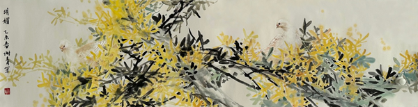 谢青的参展作品《明媚》,则表现的是北京早春的景象,黄色的连翘是春天较早盛开的花卉,亮丽的黄色与祥和的白鸽,如同明媚的春光一样温暖。