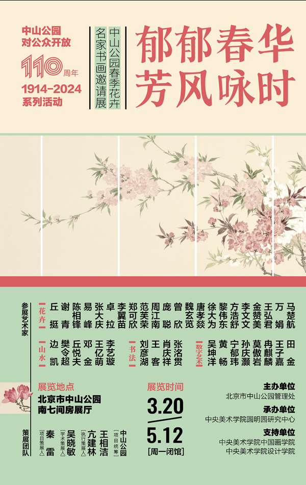 春风和煦,万物复苏。3月20日正值春分节气,北京中山公园开启第29届春花暨郁金香观赏季;由北京市中山公园管理处主办、中央美术学院圆明园研究中心承办的“郁郁春华 芳风咏时”中山公园春季花卉名家书画邀请展同期开幕。展览共展出40位艺术家的66件作品,向新中国成立75周年、北京中山公园开放110周年献礼。