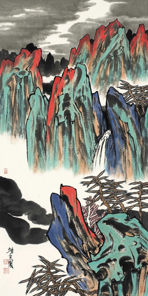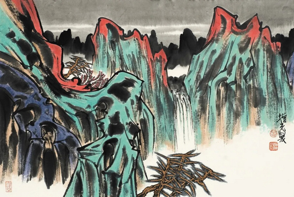 青绿山水以青绿两色为主调,追求色彩的清新与明快,营造出生机勃勃、富丽堂皇的氛围。水墨山水则注重对笔墨的运用,通过不同的笔法、墨色以及水法,表现山水的层次感和空间感,创造出千变万化的诗意效果。岳增光在这两种技法中游刃有余,在水墨的基础上,巧妙地融入青绿色彩,使画面既有水墨的韵味,又不失色彩的丰富性。