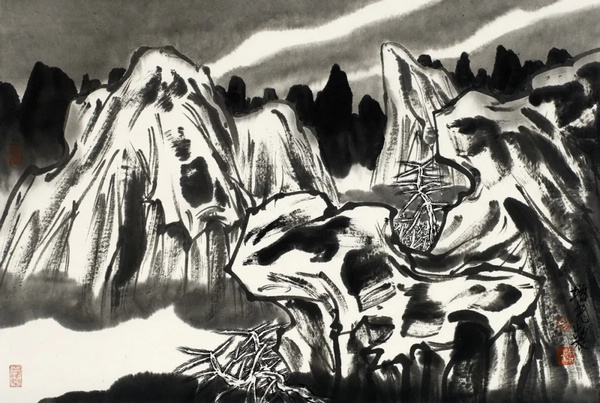 岳增光的山水画以线为主要造型,线条流畅而富有韵律感,将山石的形态、质感表现得淋漓尽致。在他的作品中,丘壑不再是静止的景物,而是充满了生命力与声音的存在。每一座山峰、每一条溪流、每一片树林,都在诉说着自己的故事,仿佛是大自然的交响乐在耳边响起。这种将自然景物赋予生命与声音的创作理念,使得观众不仅可以看到艺术家对自然的精细描绘,更能感受到源于自然、高于自然的艺术魅力。