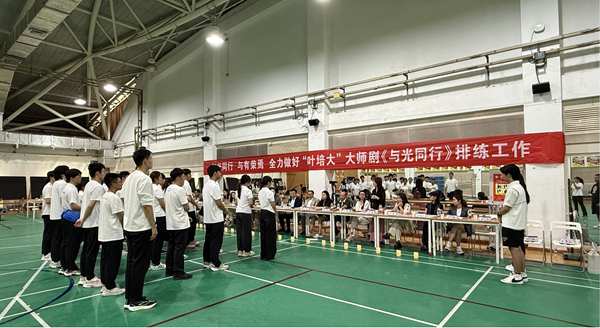 为推进文化育人工程,深入挖掘、弘扬、传承北邮精神内核,传承叶培大先生崇高的科研精神、育人精神与为学精神,进一步推进校园原创话剧的排演工作,8月31日上午,大师剧《与光同行》第二阶段排练汇报演出在西土城路校区体育馆顺利举行。本次活动特邀中国科学技术协会、中国文学艺术界联合会、国家大剧院、北京人民艺术剧院等单位的专家莅临指导,叶培大先生家属现场观摩,共同考核剧组暑期集中排练成果,并围绕剧目呈现的深化与打磨开展深入交流。国家大剧院副院长张尧,北京邮电大学原副校长任晓敏出席指导,宣传部、校团委、美育中心相关负责人员参加活动。
