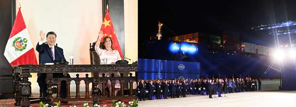 当地时间11月14日晚,国家主席习近平同秘鲁总统博鲁阿尔特在利马总统府以视频方式共同出席钱凯港开港仪式。