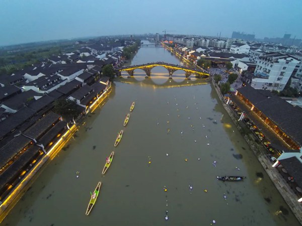 塘栖古镇的广济桥和运河上的彩灯、游船组成美丽风景。 新华社 图