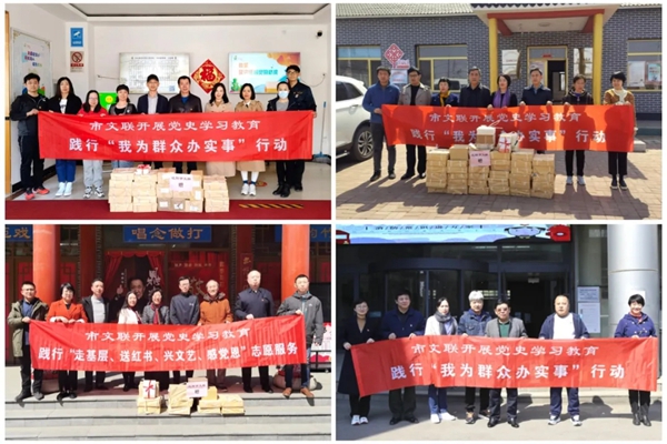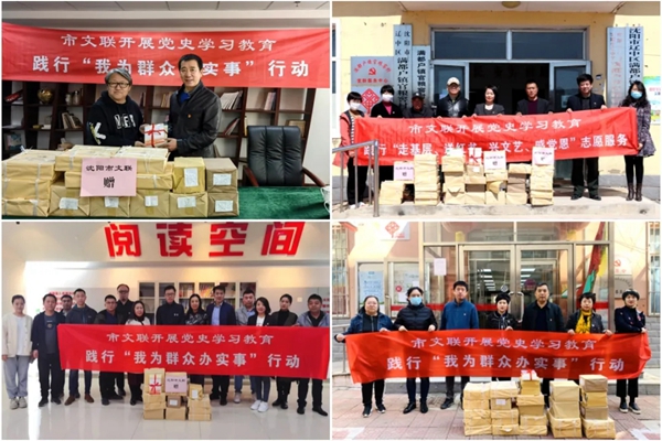 扎实开展“我为群众办实事”实践活动,是践行文艺初心使命的重要举措。市文联党组高度重视,根据基层所需,群众所想,结合工作实际,经过精心策划,搭建了4支以党支部为单位的党员志愿服务小分队。市文联购买了习近平《论中国共产党历史》《毛泽东、邓小平、江泽民、胡锦涛关于中国共产党历史论述摘编》、《习近平新时代中国特色社会主义思想学习问答》《中国共产党简史》等党史学习教育指定重点学习材料200余册,拿出印刷出版的《我和我的祖国文艺精品系列丛书》《沈阳市优秀文艺名家工程系列丛书》《沈阳文艺界》等十余种书籍6000余册,极大丰富了基层文联和扶贫村点的思想政治和文艺资源,拓宽了政治理论和文艺素养提升的广度和深度,用实际行动践行了“我为群众办实事”。