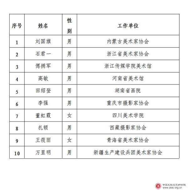 经中国文联党组同意,由国家外国专家局审批、中国文联国际联络部主办和中国文联文艺研修院共同主办的“2018中国文联赴美视觉艺术策展人高级研修班”的第一批团员名单已确定,现予公示。