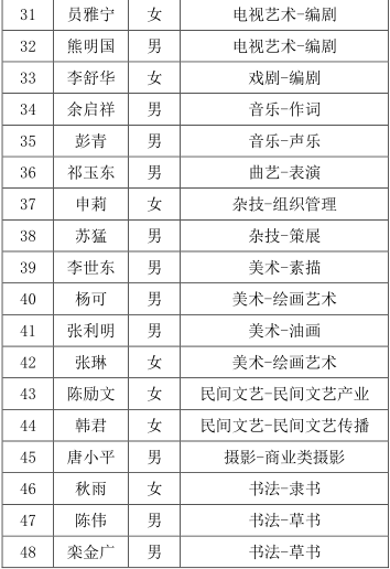 中国文联第四期全国新文艺群体拔尖人才高级研修班报名于10月8日截止,共有122人按照要求完成报名手续。其中通过各全国文艺家协会、省级文联推荐报名33人,社会自主报名89人。按照报名通知的各项要求,文艺研修院先后组织了两轮评审:由中国文联相关机关部室、文艺研修院成立评审组进行资质审核,由各艺术领域业内专家成立评审组进行专业水准评审,择优选拔。根据招生名额和选拔要求,共有48人进入拟录取学员名单。报经文联党组领导批准,现将名单公示如下: