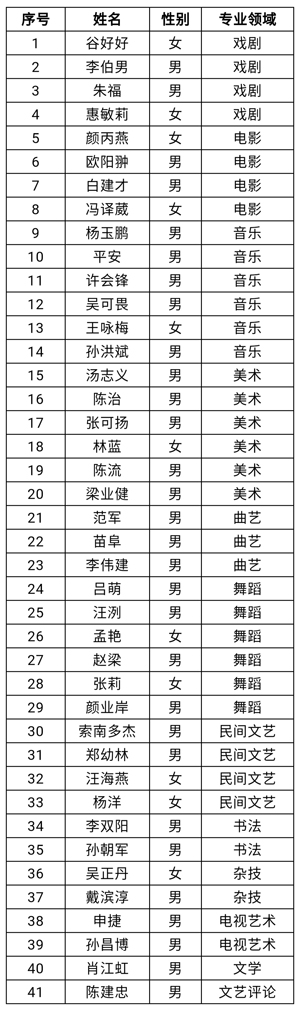 中国文联首期全国中青年文艺领军人才高级研修班人选推荐报名工作于10月25日结束,共收到推荐报名人选65人。在资质审核、征求相关部门意见基础上,综合考虑各方面因素,报经中国文联党组领导批准,确定拟录取学员41名。现将名单公示如下: