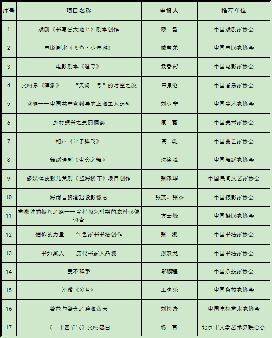 中国文联2021年度青年文艺创作扶持计划资助项目一览表