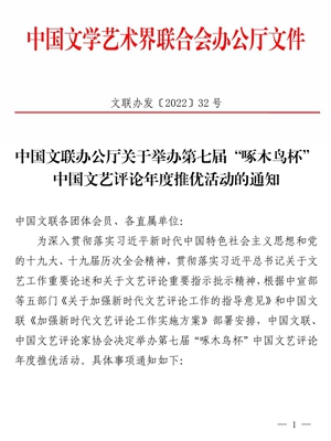 为深入贯彻落实习近平新时代中国特色社会主义思想和党的十九大、十九届历次全会精神,贯彻落实习近平总书记关于文艺工作重要论述和关于文艺评论重要指示批示精神,根据中宣部等五部门《关于加强新时代文艺评论工作的指导意见》和中国文联《加强新时代文艺评论工作实施方案》部署安排,中国文联、中国文艺评论家协会决定举办第七届“啄木鸟杯”中国文艺评论年度推优活动。具体事项通知如下: