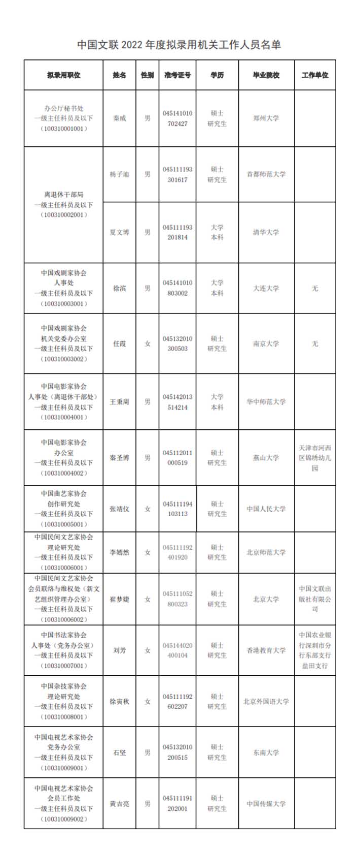 根据2022年度中央机关及其直属机构考试录用工作有关要求,经过笔试、面试、体检和考察等程序,确定秦威等14名同志为中国文联2022年度拟录用机关工作人员(名单附后),现将有关情况予以公示,公示期为5个工作日。公示期间如有问题,请向中国文联人事部反映。