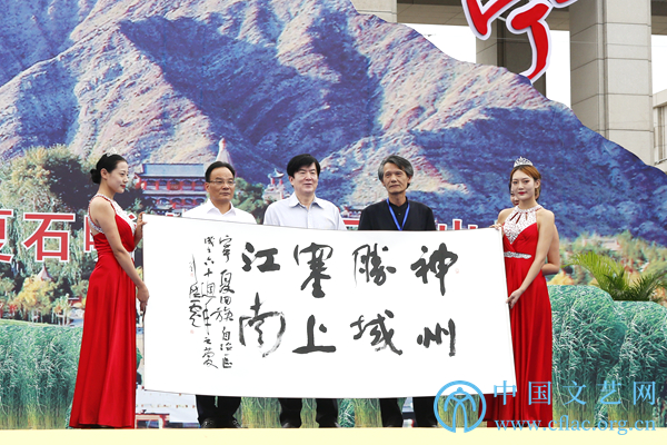为庆祝宁夏回族自治区成立60周年,8月7日至10日,中国文联文艺志愿服务团将赴宁夏多地开展文艺志愿服务活动。8月8日,由中国文联、宁夏回族自治区党委宣传部、中国文艺志愿者协会主办的“中国梦·宁夏情”庆祝宁夏回族自治区成立60周年——中国文联文艺志愿服务团走进石嘴山市慰问演出在石嘴山市行政中心广场举办。图为中国文联党组书记、副主席李屹向石嘴山市赠送由中国书法家协会副主席刘洪彪题写的书法作品。中国文艺网 周春桃 摄