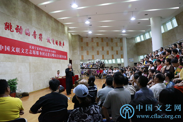 为庆祝宁夏回族自治区成立60周年,8月7日至10日,中国文联文艺志愿服务团将赴宁夏多地开展文艺志愿服务活动。8月7日晚,在石嘴山市举办了书法、音乐、舞蹈、电影、电视等辅导培训活动。图为音乐艺术家方锦龙主持音乐辅导培训现场。中国文艺网 周春桃 摄