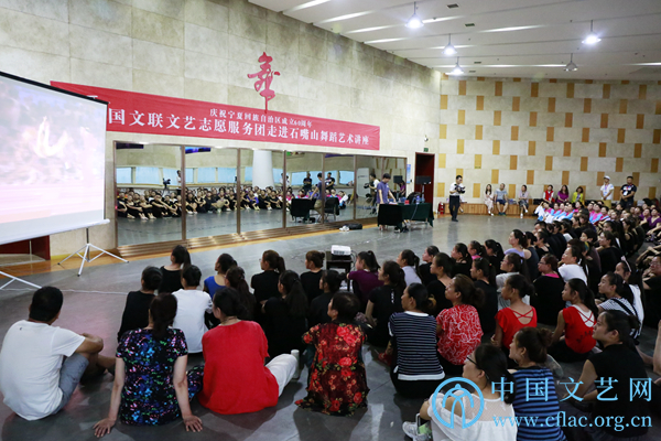 为庆祝宁夏回族自治区成立60周年,8月7日至10日,中国文联文艺志愿服务团将赴宁夏多地开展文艺志愿服务活动。8月7日晚,在石嘴山市举办了书法、音乐、舞蹈、电影、电视等辅导培训活动。图为中国舞蹈家协会副主席黄豆豆主持舞蹈辅导培训现场。中国文艺网 周春桃 摄