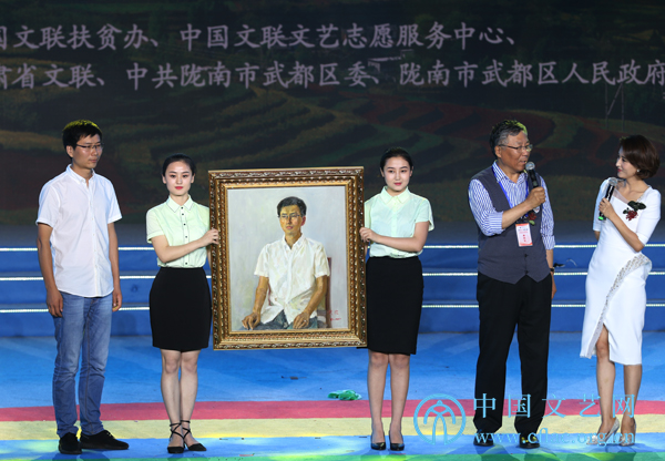 清华大学美术学院教授、中国文艺志愿者协会理事、油画家王铁牛向武都村官武宏赠送为他所作的画像。中国文艺网 白伟 摄