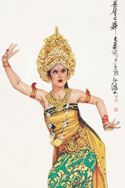 李鼎成《巴厘之舞》,中国画,136cm×68cm,2016