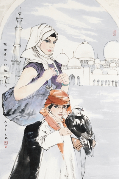 李青稞《阿联酋扎耶德清真寺》,中国画,136cm×68cm,2016
