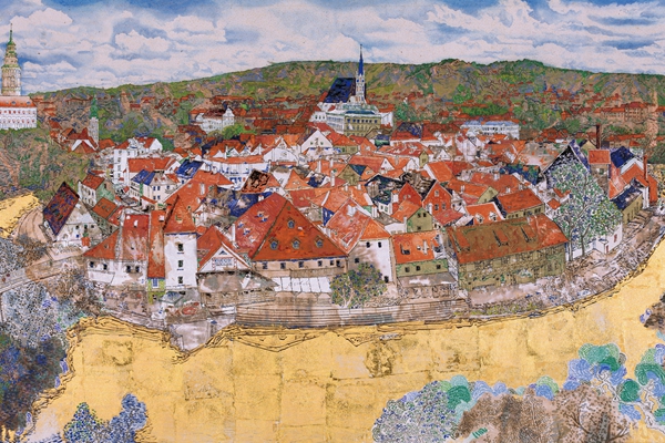 张亮《捷克克鲁姆夫小镇》,中国画,80cm×165cm,2017