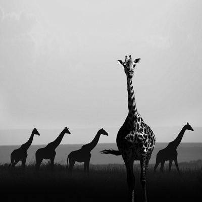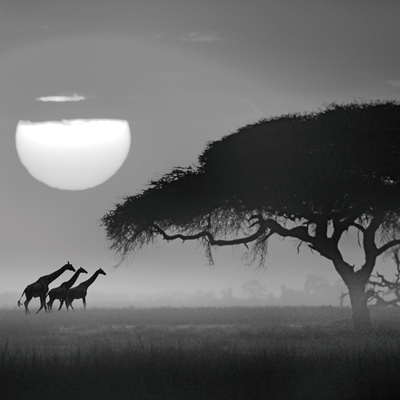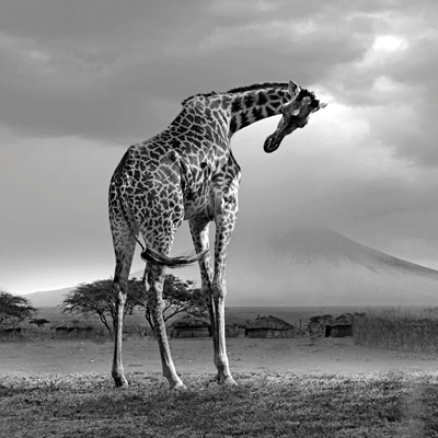 舞动的长颈鹿,高傲而优雅。乞力马扎罗,映衬着合欢树与茅草房,是动物、人与自然的和谐映照。