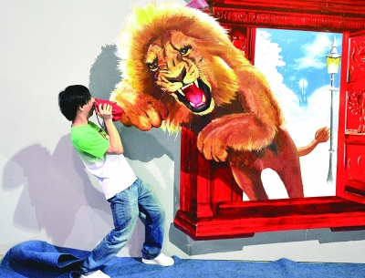5月18日,市民正在体验展出的视觉作品。当日,奇幻绚丽的4D空间体验展在武汉国际会展中心开展,80余件视觉作品和一个动感影院在展馆呈现,吸引不少市民前来欣赏。据介绍,4D空间是一种错觉艺术,利用光的折射、反射以及远近法、阴影法,使人产生视觉错觉,形成视觉的立体效果。和以往美术展览以静态观赏不同的是,4D作品增加了互动性,市民在画作前拍出来的照片如同身临其境。 (新华社记者 肖艺九摄)