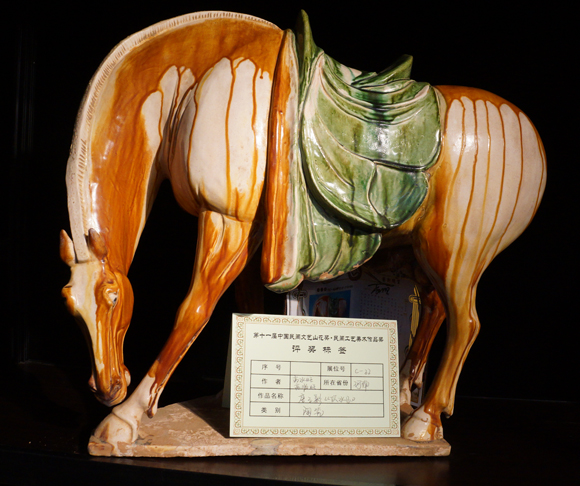 民博会期间还举行了中国民间文艺山花奖(工艺美术作品奖)评选活动,图为参评作品高仿 唐三彩“饮水马”