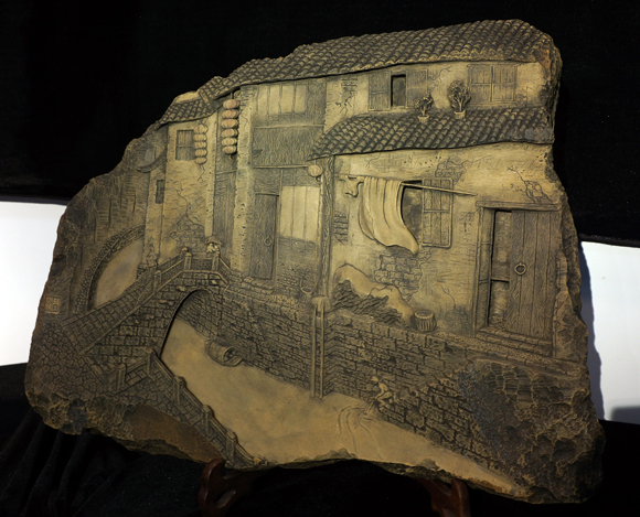 民博会期间还举行了中国民间文艺山花奖(工艺美术作品奖)评选活动, 图为参评作品澄泥石雕摆件“人生三忆”