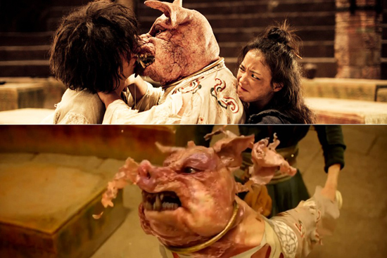 猪刚烈被舒淇打出原型后,身上的美男人皮破碎散开,一直流着哈喇子的猪跃然银幕,舒淇让文章从他嘴里吸出妖怪的恶灵,并给猪老师来了好几个大特写。虽然这个造型在里一点都算不上恐怖,但还是有观众在电影院里宁愿用爆米花桶挡住自己孩子的眼睛。