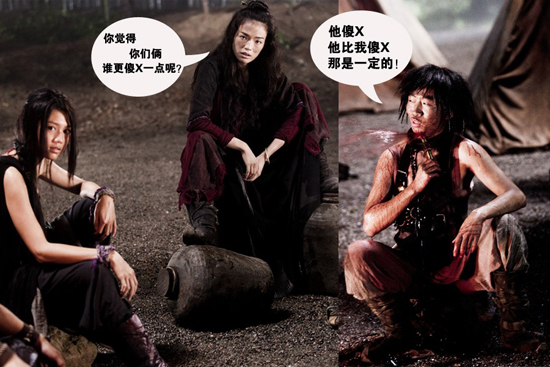 舒淇带领的驱魔团队中,有个喷血的哥们儿一直没法把自己的装置弄好,结果不得不一直喷着血说话,舒淇问他:“你觉得你们俩谁更傻X呢?”他说:“他傻X,他比我傻X,这是一定的!”,这个搞笑的桥段因为带了脏字而成为观众热议的话题:“电影审查部门放年假了么?还是从《一代宗师》开始,电影里终于可以随便飙脏话了?”
