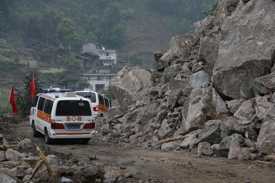 医疗救援队行进在地震灾区碎石堆积的路上 杨卫华 摄