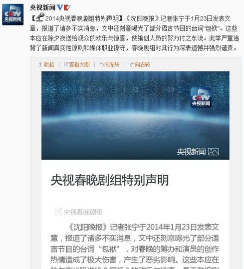 2014央视春晚剧组特别声明全文如下:“《沈阳晚报》记者张宁于1月23日发表文章,报道了诸多不实消息,文中还刻意曝光了部分语言节目的台词“包袱”,对春晚的筹办和演员的创作热情造成了极大伤害,产生了恶劣影响。这些本应在除夕夜送给观众的欢乐与惊喜,是无数编剧、导演和演员们苦心编创、费尽心血的智慧结晶,却因恶意剧透而导致破坏了预期效果,使编创人员的努力付之东流。此举严重违背了新闻真实性原则和媒体职业操守,春晚剧组对其放弃职业底线、无视职业责任感的行为深表遗憾并强烈谴责。”